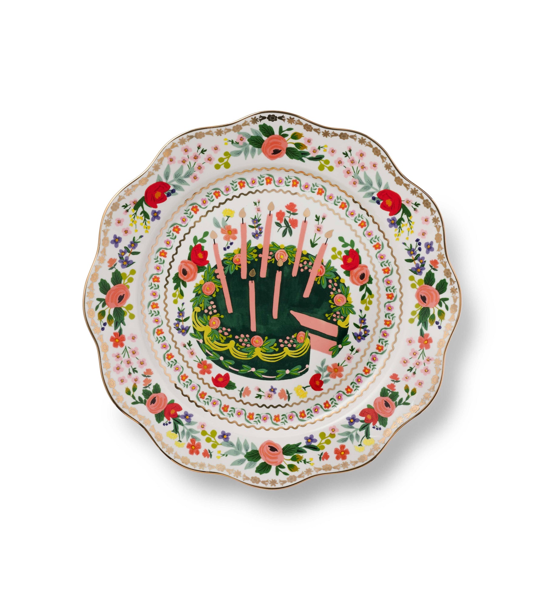 Serve your celebratory desserts with style using our beautiful cake plate, featuring detailed illustrations and elegant metallic gold accents.