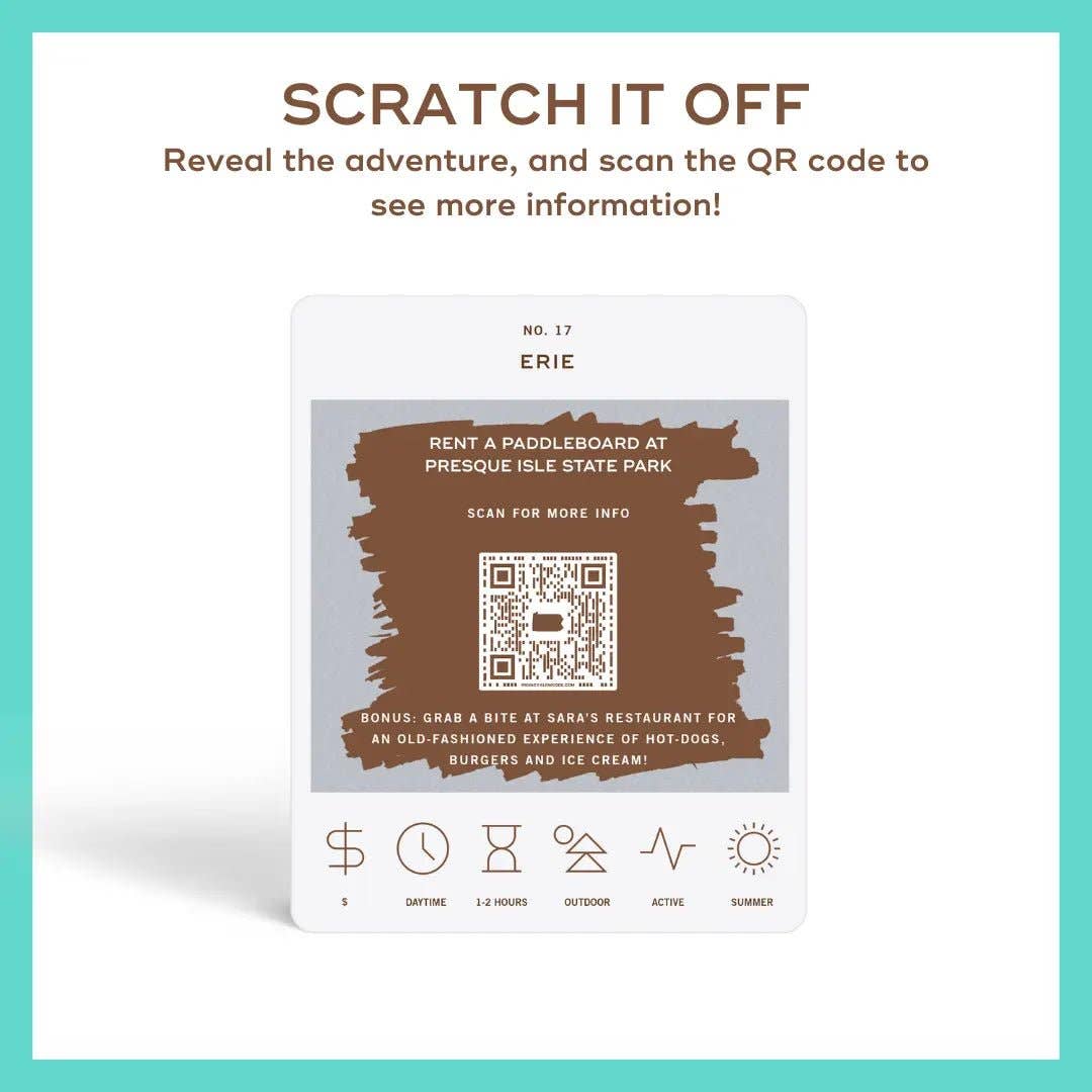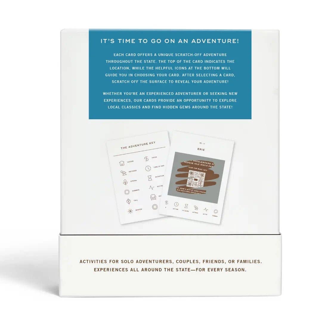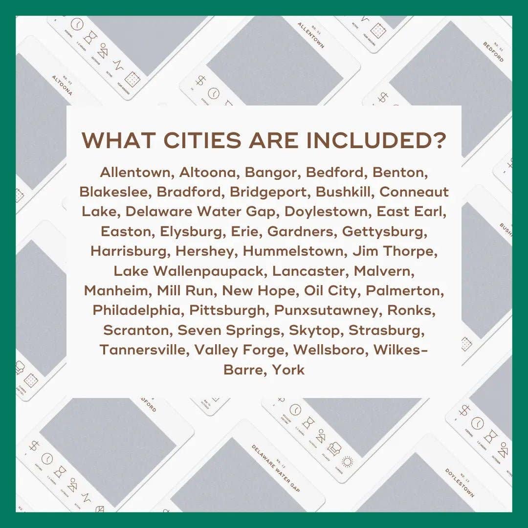 Discover new corners of the Keystone State with the Pennsylvania Adventure Bucket List. This interactive set features 50 scratch-off adventures across Pennsylvania—each card revealing a unique experience once scratched. Choose a city, check the icons for season, cost, and time of day, then start exploring. Perfect for locals and travelers alike looking to make memories close to home.