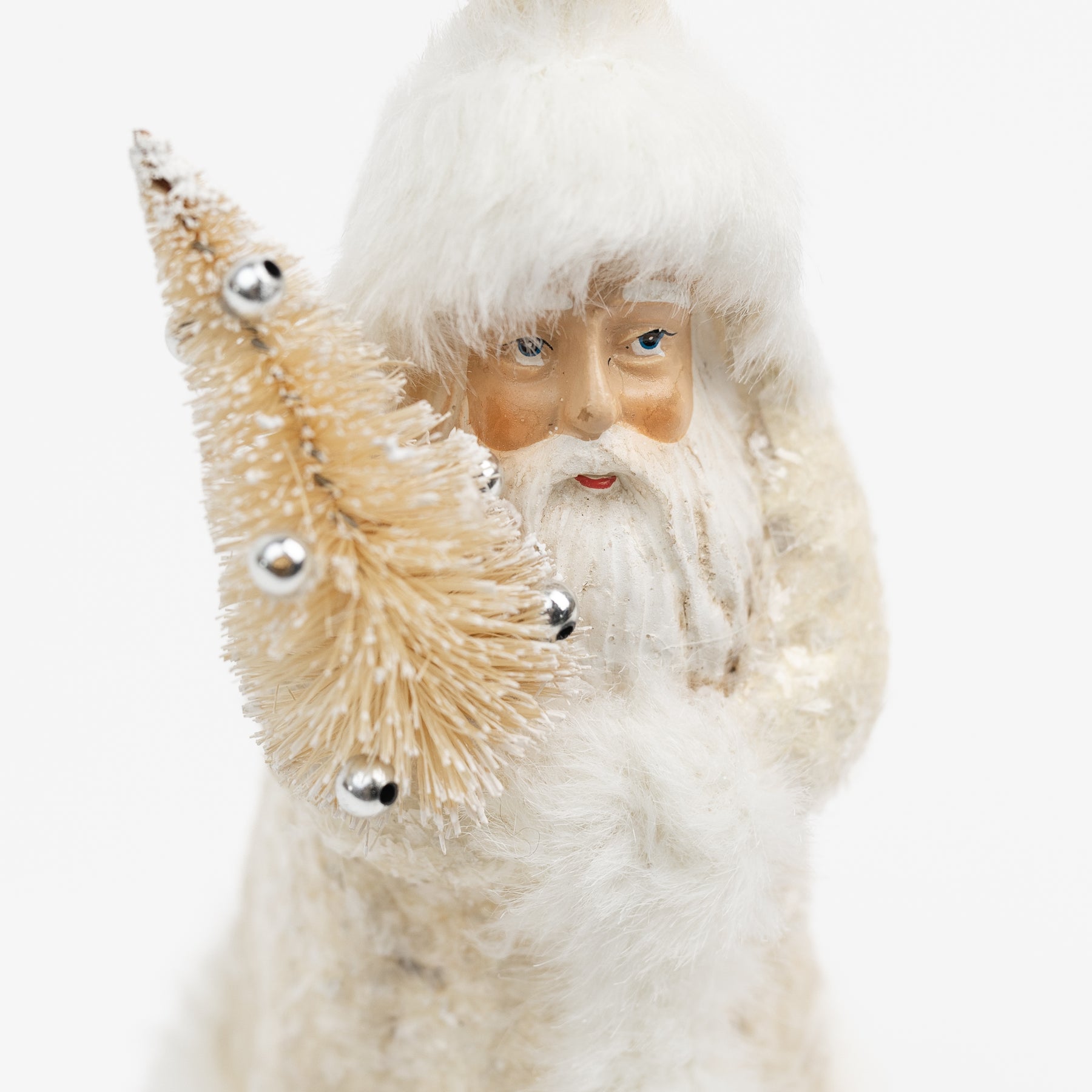 The 8.25" Snowy Santa captures the charm of a wintry holiday scene, dressed in cream with soft fur trim and holding a frosted bottlebrush tree. A cozy and festive accent, it brings warmth and a touch of nostalgia to seasonal displays.