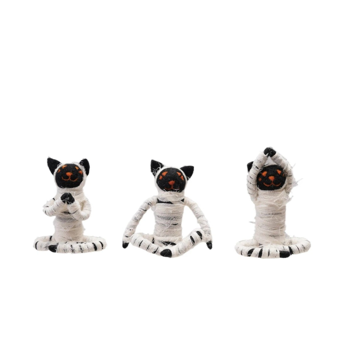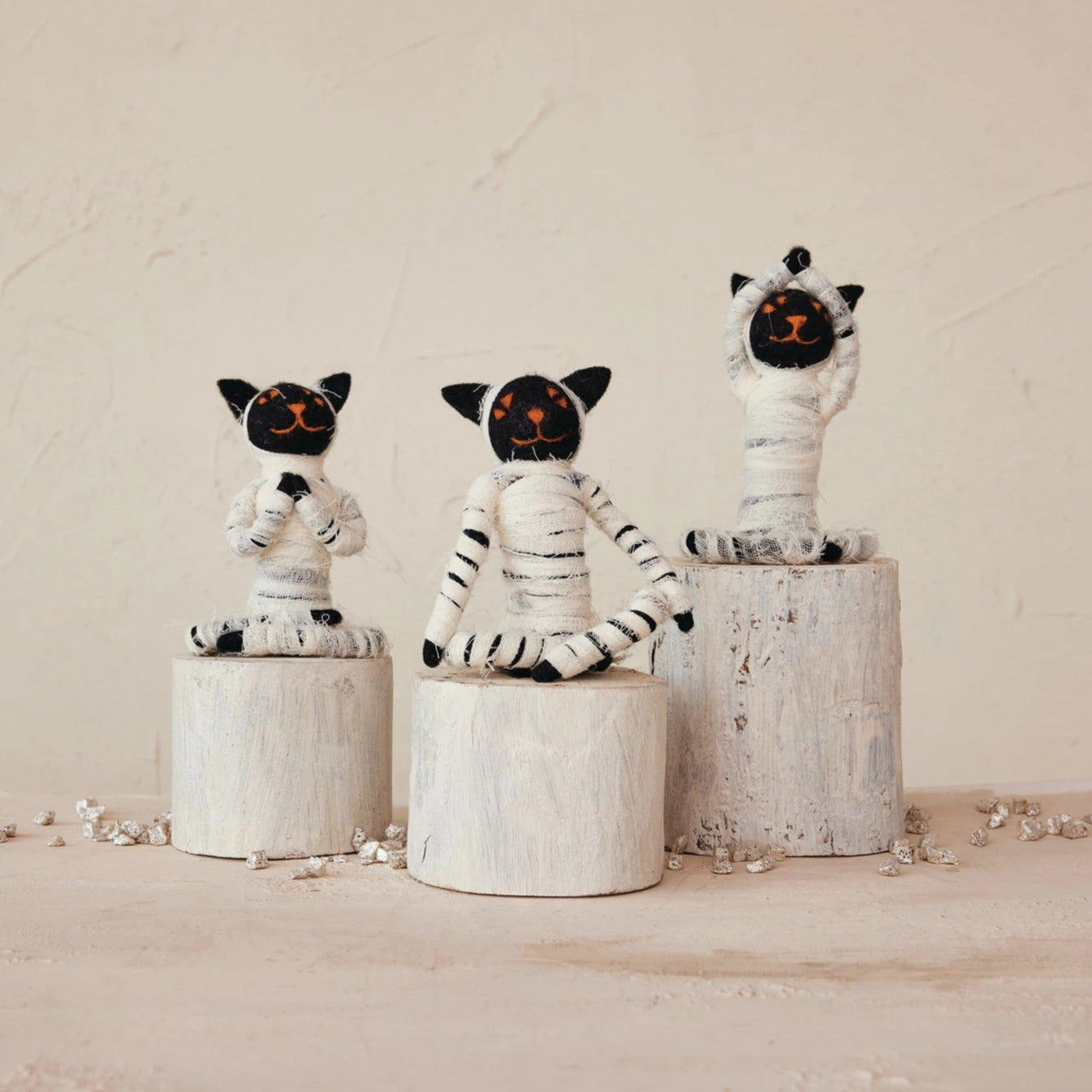 Strike a spooky—and adorable—pose with the Yoga Mummy Cat. Handmade from fabric and wool felt, each cat is wrapped in a mummy costume, perfect for adding a playful Halloween touch to any shelf or tabletop. Available in three individual styles.