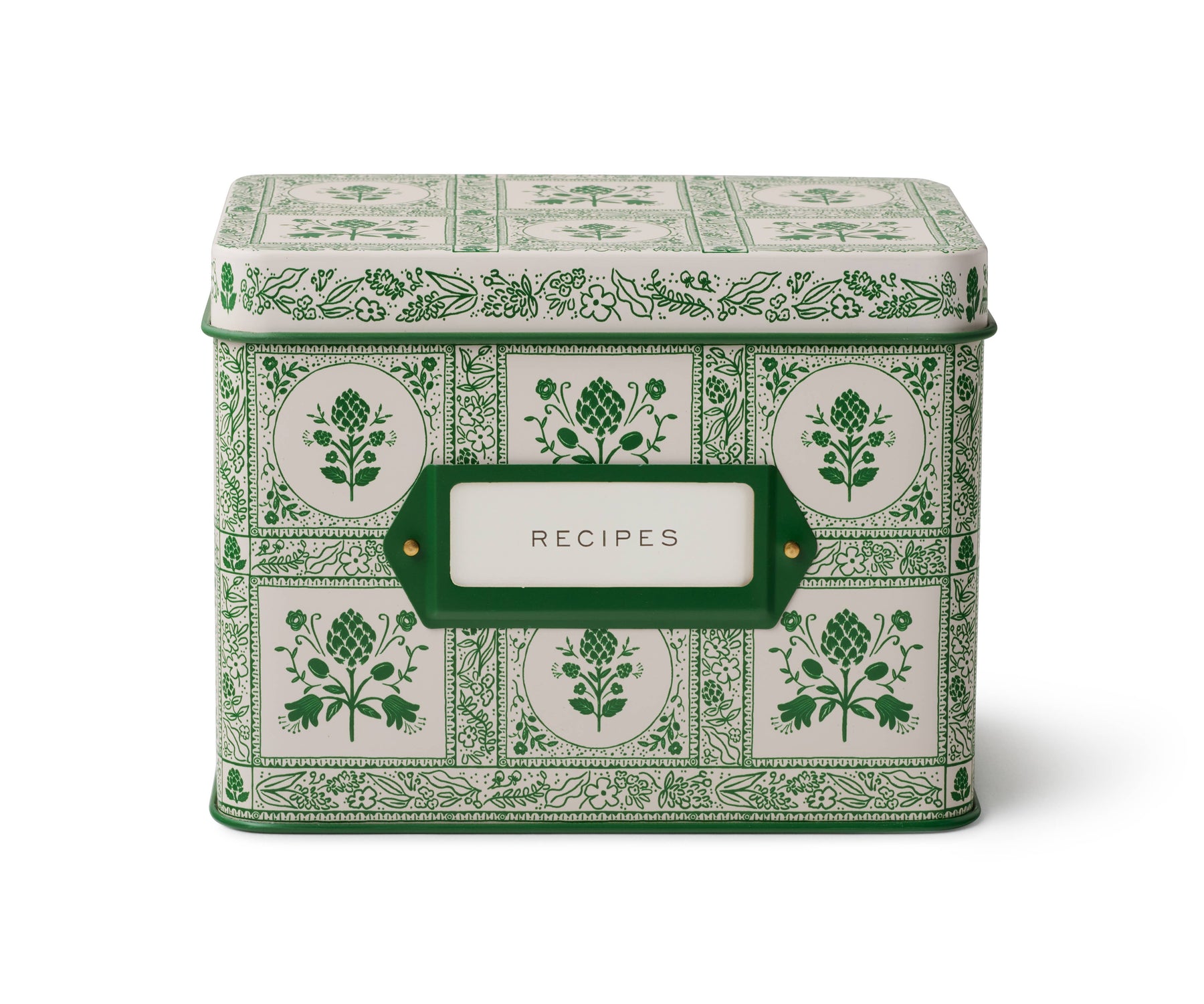 Artichoke Recipe Tin keeps your kitchen treasures beautifully organized. With space for up to 200 recipe cards, a shimmering gold interior, and charming printed illustrations, it’s as stylish as it is practical. Includes 24 recipe cards and 12 dividers to get you started.