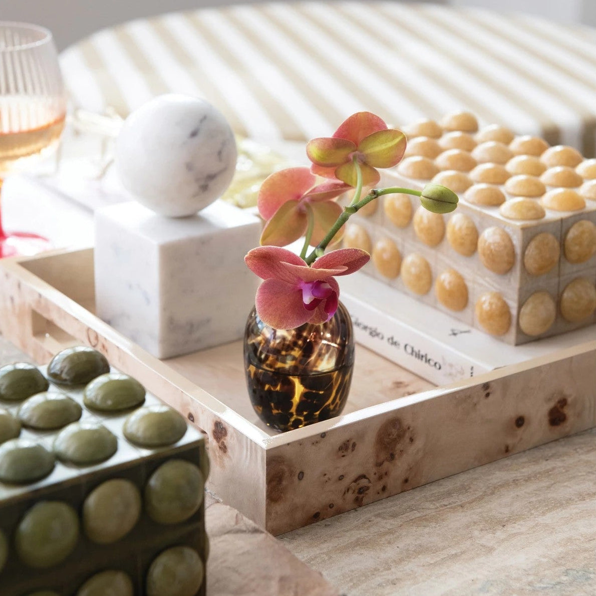 Charming and compact, the Tortoise Glass Vase offers subtle patterning reminiscent of natural tortoise shell. Perfect for single stems, small floral arrangements, or as a decorative accent, its handcrafted glass adds warmth and texture to any tabletop or shelf.