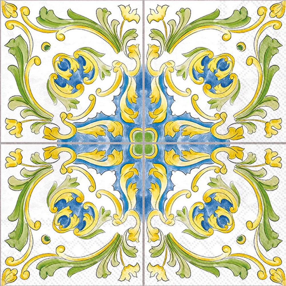 The Lenger Tile Cocktail Napkin brings Mediterranean charm to any gathering with its intricate floral patterns and vibrant mix of white, green, yellow, and blue.