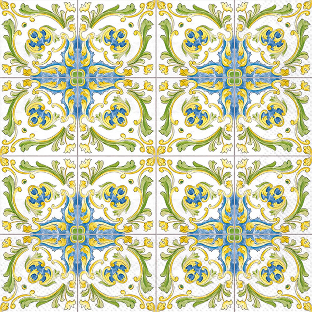 The Lenger Tile Luncheon Napkin brings a touch of Mediterranean elegance to any table with its intricate floral pattern and rich blend of blue, green, yellow, and white.
