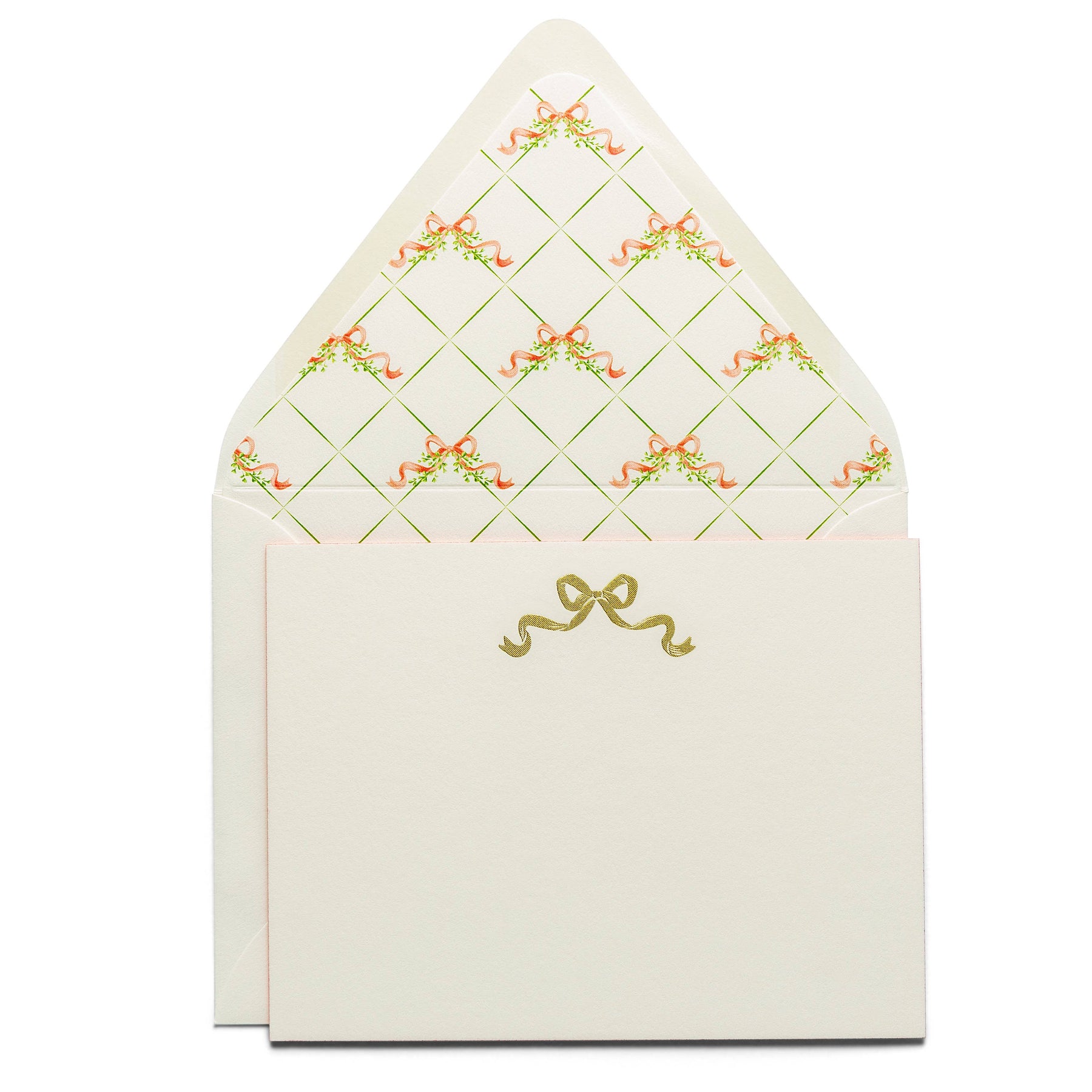 The Bow Engraved Flat Notecard Set brings a refined touch to everyday correspondence. Each card is engraved in gleaming gold on ultra-thick cotton stock, then finished with hand-painted edges for a luxurious feel and a beautifully weighted presence in the hand. Paired with lined envelopes that add a polished flourish, this set is perfect for heartfelt notes, thoughtful thank-yous, and anyone who delights in stationery with unmistakable craftsmanship.