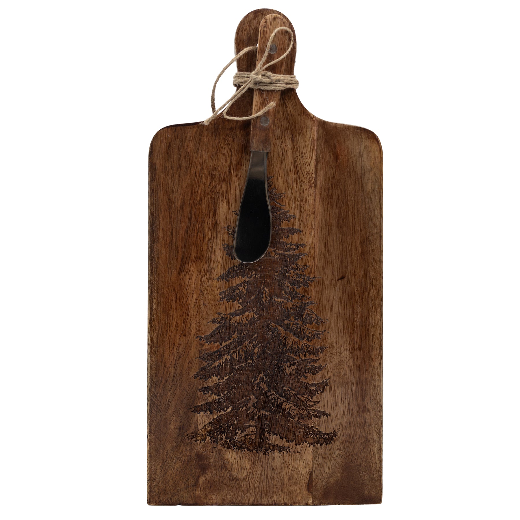 Handmade from sustainable mango wood, the Evergreen Board & Spreader Set features sketch-style evergreen artwork and natural variations that make each piece one of a kind. Includes a coordinating spreader, perfect for serving cheese or spreads with a festive touch.