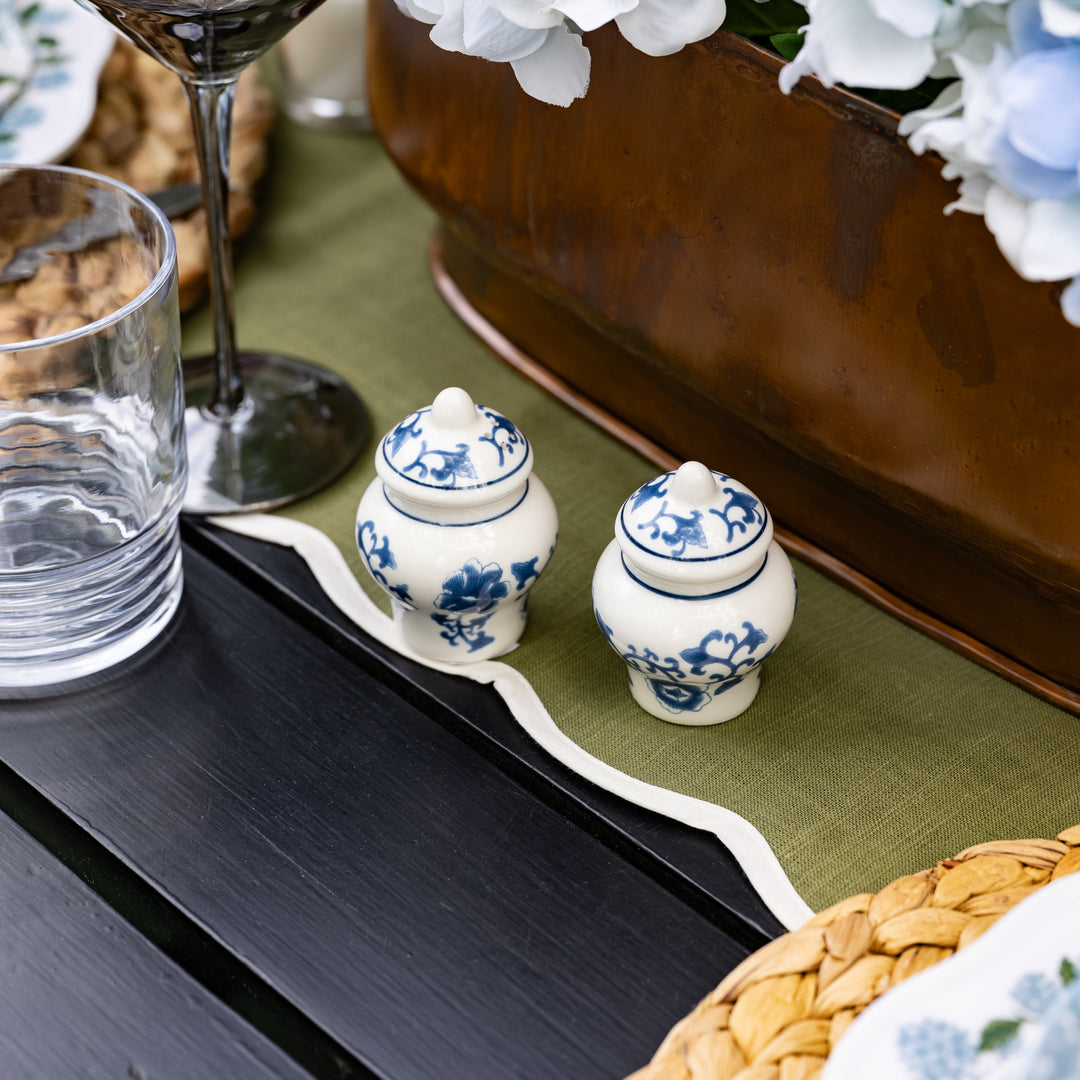 This Ginger Jar Salt & Pepper set brings the perfect blend of classic chinoiserie style and playful charm to your table. Hand-painted in a timeless blue and white floral pattern, they’re as chic as they are functional.