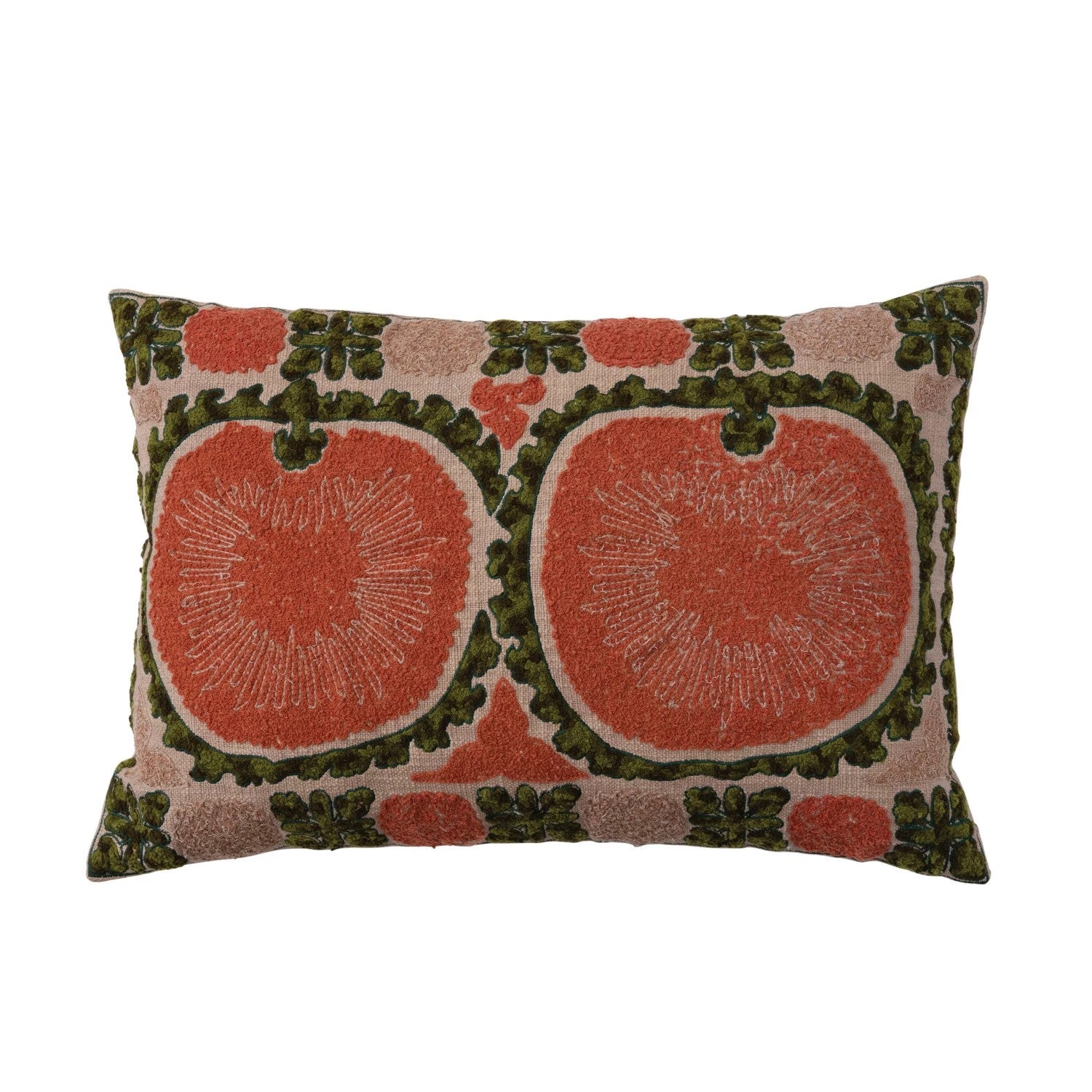 Add an earthy touch to your space with this Pomegranate Embroidered Lumbar Pillow, featuring intricate terra-cotta and green embroidery. The chambray back includes a convenient opening for easy insert removal.